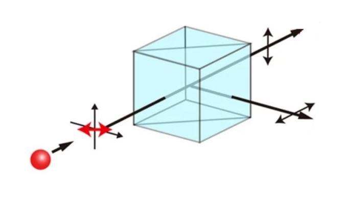 单个光子垂直进入偏振分束器后,随机地从两个可能的出口出来,如果是沿着原来的运动方向,那么偏振方向垂直于原来的运动方向,而且平行于两个拼接的半立方体的接触面;如果垂直于原来的运动方向,那么偏振方向就沿着原来的运动方向。