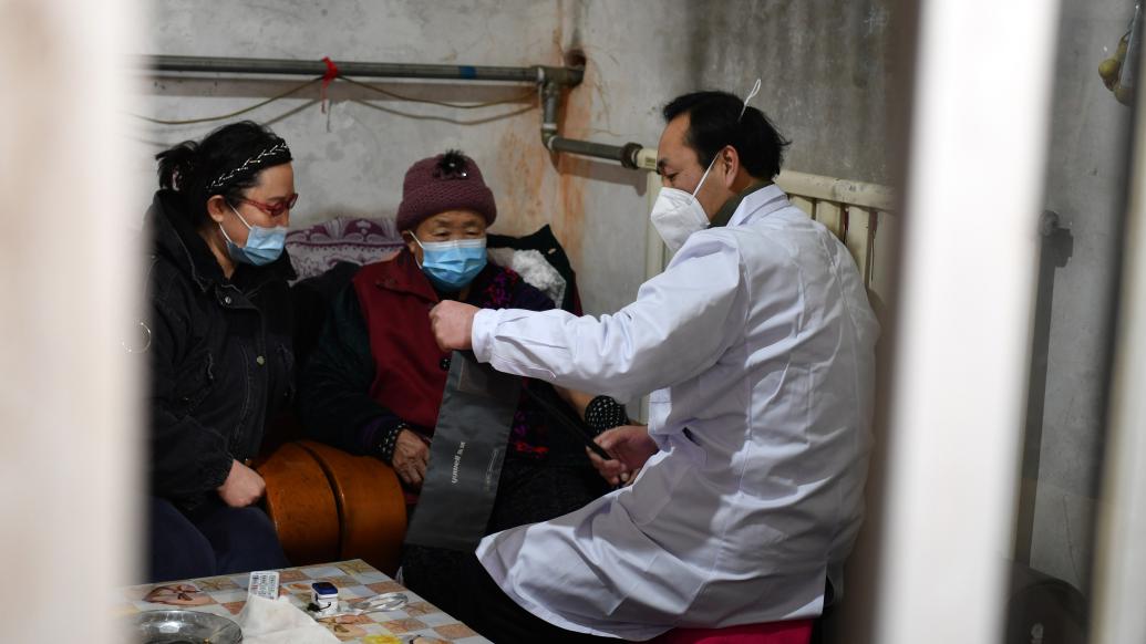 乡村医生深入农户家中,为一名九旬老人做相关检查。视觉中国 图