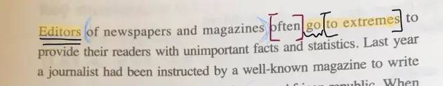 加上去,句子就变成了"editors of newspapers and magazines go to extremes." 这个of很自然的加上去哦,你讲过的成分都是社恐,互相之间没有介绍人就会很尴尬,所以要介词。我:哈,你记住了社恐。那这个状语often怎么记住呢?