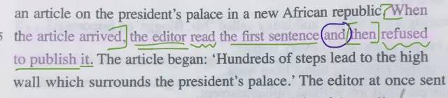 小朋友:对的。这句其实很好背的,就“时间”加“编辑拒绝发表”。前面的主语是the editor谓语是read宾语是the first sentence,后面省略了主语,只有谓语refused加宾语to publish it。