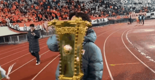 泰山队外援孙准浩赛后捧着奖杯拍照时,只能一手捧着奖杯,另一只手将断掉的角按上去,勉强扶着完成留影。