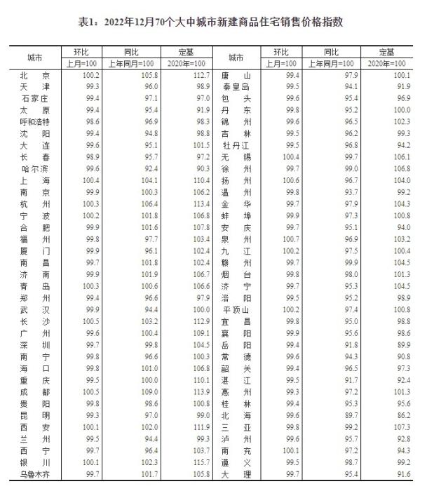 2022年12月70个大中城市新建商品住宅销售价格指数。截图自国家统计局官网