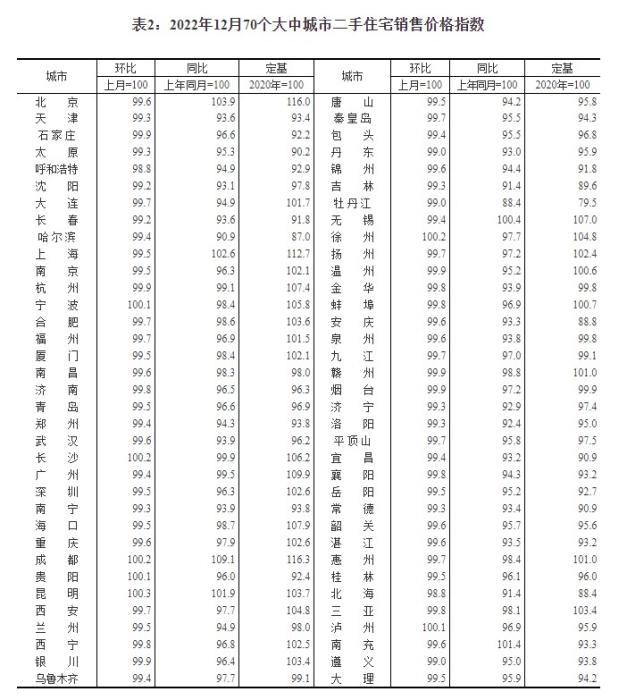 2022年12月70个大中城市二手住宅销售价格指数。截图自国家统计局官网