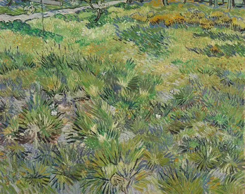他在一封给弟弟提奥的信中提到了当时正在创作的两件作品,这是其中一幅;另一幅是1890年所作的《圣保罗医院花园中的松树和蒲公英》(附图见微信导览),《长草地与蝴蝶》很像是后者画面中近处长草地部分的放大局部。梵高采用了印象派短小凌乱的笔触,但是调整了用笔的厚度和长度,从而强调了这片长草地所承载的情感价值。