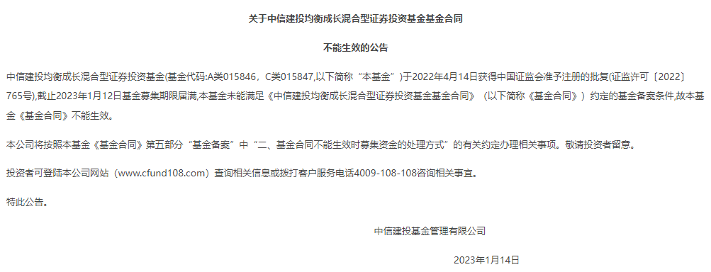 1月14日,中信建投基金发布公告称,中信建投均衡成长于2022年4月14日获得中国证监会准予注册的批复,截至2023年1月12日,基金募集期限届满。该基金未能满足《基金合同》规定的基金备案条件,故《基金合同》不能生效。