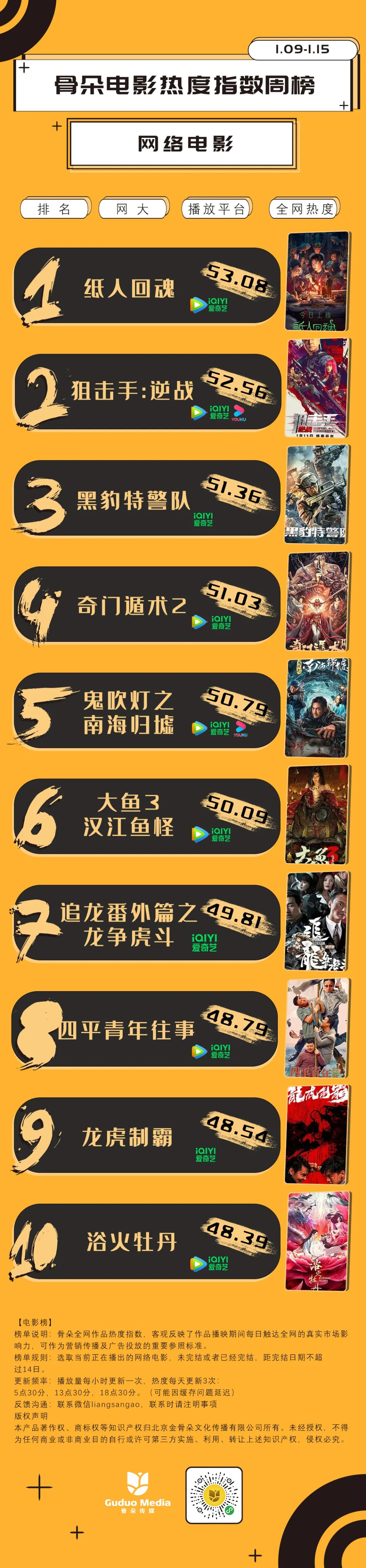 本期网络电影榜单前三中,榜首由上期的榜三《纸人回魂》夺得,另外两部均是本期新上线的电影:上线3天的《狙击手:逆战》和上线6天的《黑豹特警队》。上期榜单前二《鬼吹灯之南海归墟》《奇门遁术2》于本期退至第五、第四。