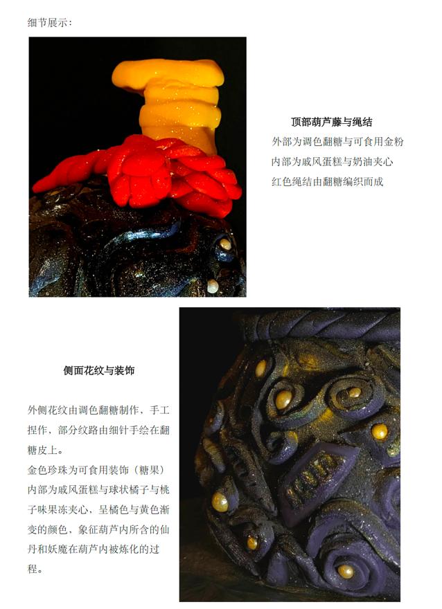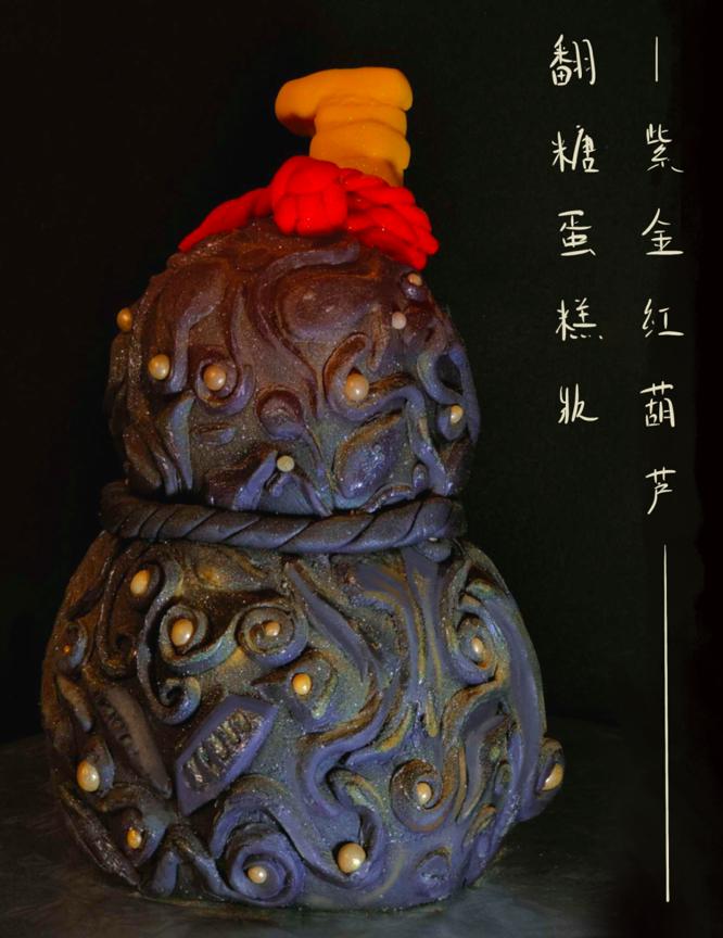 首次出现于吴承恩版《西游记》小说第三十五回,为太上老君存储仙丹的容器。在唐僧一行人西行的路上,太上老君看守金炉与银炉两童子托化妖魔,偷执紫金红葫芦阻挡师徒四人,葫芦后被孙悟空夺走,将二妖化入其中。蛋糕上部为戚风蛋糕、桃子果冻、卡仕达酱、桃子、草莓粉(顶部调色)。下部为戚风蛋糕、柑橘甘纳许、柑橘白巧克力慕斯、柑橘果冻。