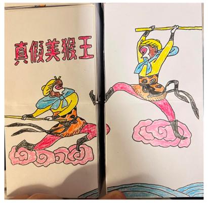 翻转盒子的图案来源于上海人民美术出版社于20世纪80年代出版的西游记连环画。全套连环画共20册,图案的灵感来源于其中10册的封面,也是用其中大家耳熟能详的故事来作为翻转盒子的图案。悟空高达化