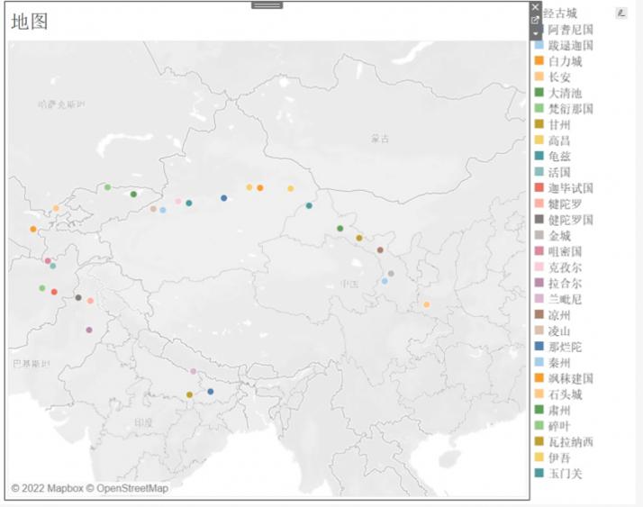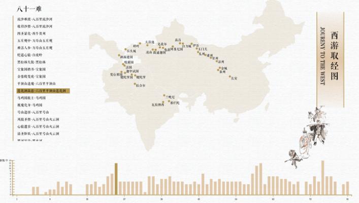 《西游记》小说中有大量对于地理空间的描述,李明宣同学运用d3.js和Vue算法,试图根据历史记载的玄奘取经路线和小说中出现的地理信息的对比,还原出当时人们对于世界的地理想象。他将玄奘取经的路线图与小说中的“八十一难”对应的地理位置用网页呈现出来,并实现了简单的交互。《