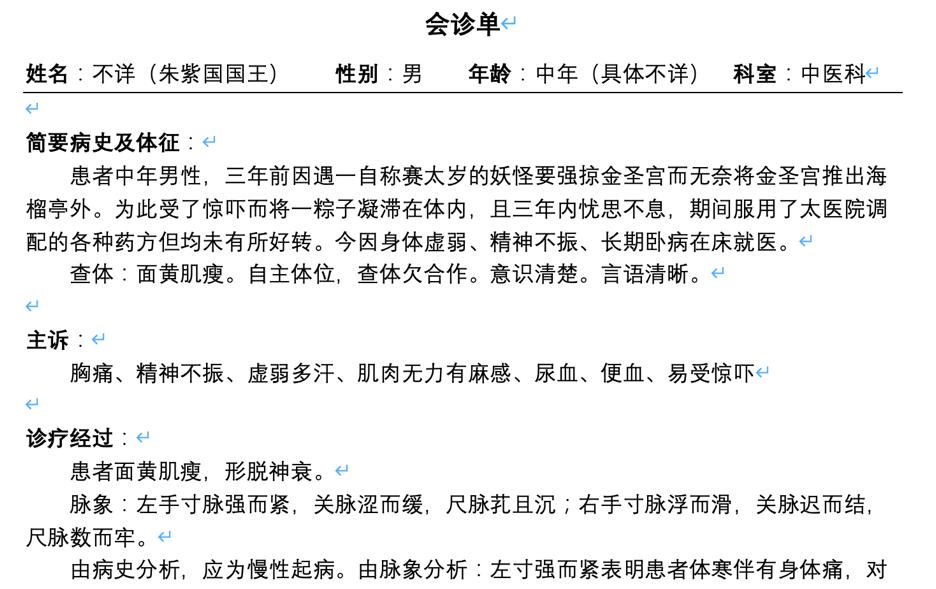 医学部高瑞宸同学根据《西游记》中的记录为朱紫国国王进行了跨越时空的“会诊”:《朱紫国国王会诊单》