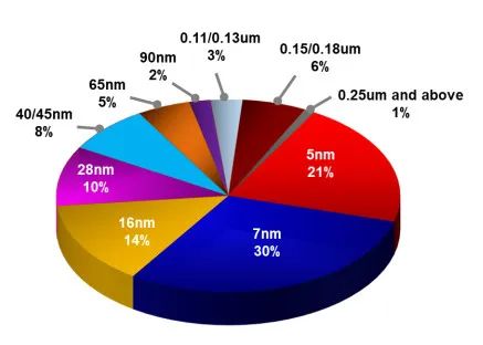 第二,今天全球的集成电路市场,需求量和使用量最大的是成熟制程的芯片。先进制程的芯片仅仅只占据了很低的市场份额。台积电2021年还大幅扩产28纳米成熟制程的芯片以应对市场的紧缺。车用芯片基本上28 nm、45 nm以及 65 nm成熟制程的天下,只有自动驾驶芯片等少数汽车芯片才需要用到先进制程。航天等工程领域的芯片甚至还在使用微米级别的,虽然使用量有限。