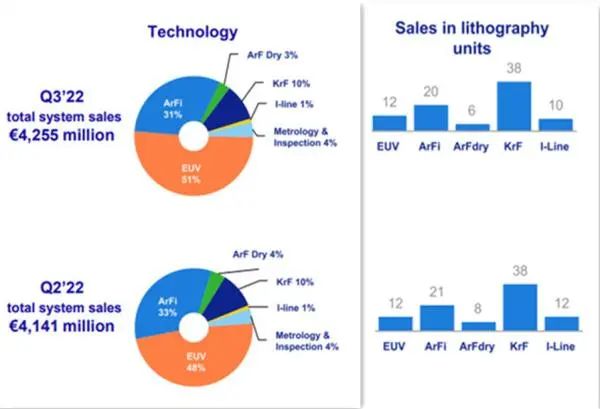 2022年阿斯麦三季度财报显示,以成熟制程的DUV包括Arf和KrF销售量最大,最先进的EUV光刻机销售量很小,但是销售额不容小觑。