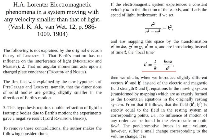 “众所周知,理论同实验之间的这种矛盾,可以通过洛伦兹和Fitzgerald的假设(根据这种假设,运动物体在运动方向发生一定的收缩)在形式上消除。然而,这一特设假设,似乎只是一种拯救理论的人为方法:迈克尔逊—莫雷的实验,实际上恰好证明现象是符合相对性原理的,虽然这并不是洛伦兹的理论所预期的结果。因此,看起来洛伦兹的理论似乎应该被舍弃,而以一个基础与相对性原理相合的理论来取代,因为这样一个理论能够方便地预测到迈克尔逊—莫雷实验的零结果。