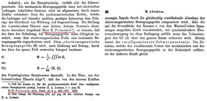 值得注意的是,就在爱因斯坦显然仔细研究过的Abraham1902年的《电子的动力学》文章中,有下面一段有关庞加莱的叙述: