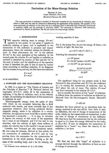 “辐射之质量(the mass equivalent of radiation)已经隐含在庞加莱的辐射动量公式中了,发表于1900年,并且被庞加莱用在展示他的分析的应用中。辐射之质量与辐射物的质量损失的相等,可以从庞加莱的辐射动量(1900年)和他的相对性原理(1904年)中推导出来。爱因斯坦1905年推导的论证过程,受到过普朗克的质疑,是有缺陷的。他没有导出质能关系。”