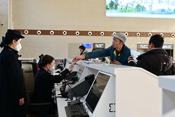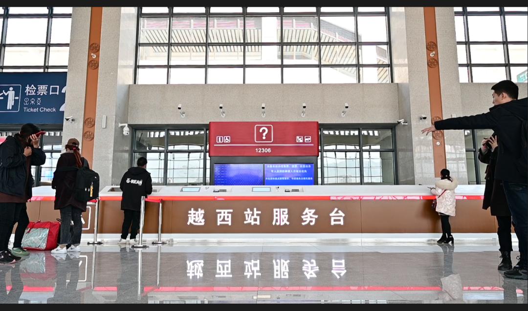 1月11日上午,越西站候车大厅人来人往,位于检票口旁的服务台前,咨询、办理乘车业务的旅客络绎不绝。