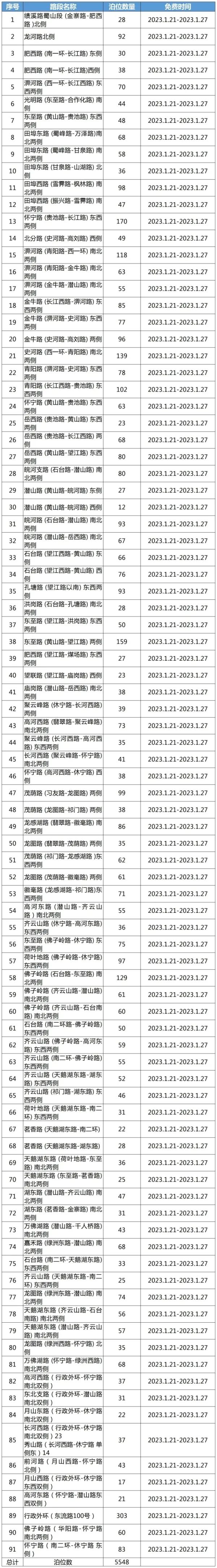 值得一提的是,在1月21日—1月27日,蜀山区91个路段的5548个泊位也将全部免费开放。