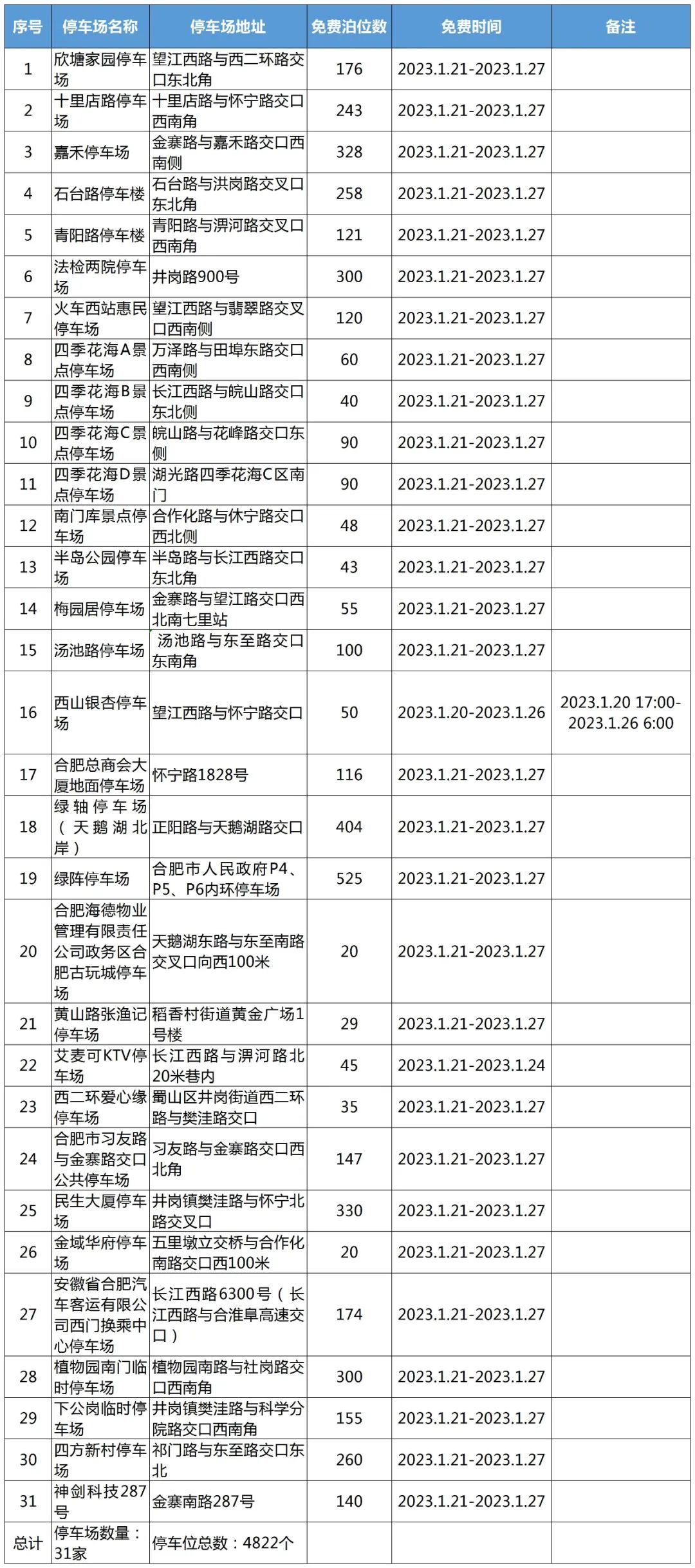 民生大厦停车场。春节期间,蜀山区停车管理企业将提供免费停车位4822个。本次提供免费停车位的时段,分为1月21日—1月27日、1月22日—1月24日和1月20日—1月26日多个时段,市民可以查看“蜀山区2023年春节免费路段”“蜀山区2023年春节期间免费对外开放停车场”(见文后表格),查看各停车场和路段的具体免费停车时段。值得一提的是,除了31个停车场提供的4822个泊位外,蜀山区路内泊位春节期间全部免费,免费时间为1月21日—1月27日。