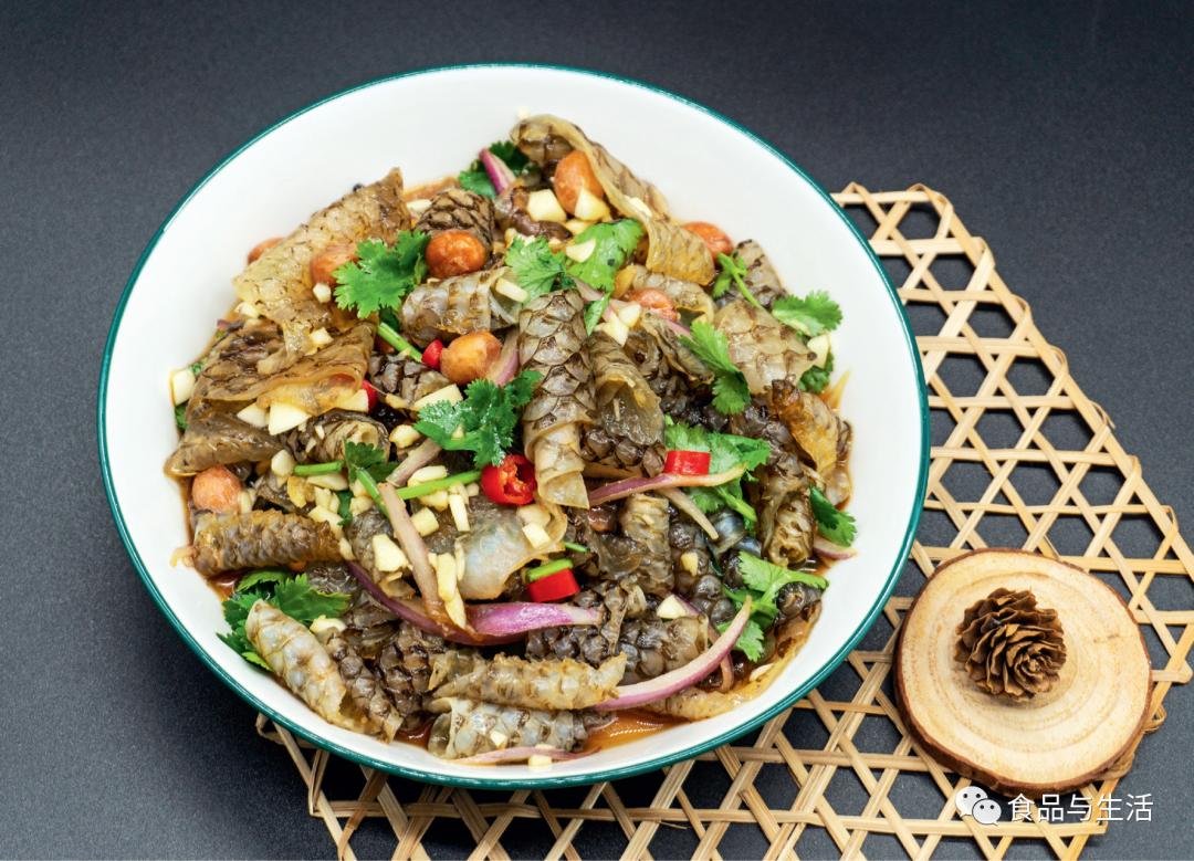 只见一大碟凉拌鱼皮犹如小山一般堆得高高的。一条条自然卷起的鱼皮,配上青绿的葱丝、嫩黄的姜丝、香脆的花生粒、白芝麻以及鲜绿的香菜叶,真是卖相十足。吃口如何呢?轻轻夹起一条沾满香油的鱼皮,慢慢放入口中,鱼皮在唇齿间游动,爽脆、耐嚼、喷香,令人赞叹,果然不错!有人质疑,如此透明、韧滑、爽脆的鱼皮是否如人造海蜇丝、人造牛排之类一样,也是用代用品制成的?大厨笑着告诉我们,鱼皮当然是真的,如假包换。因为鱼皮本身就是“废”物利用,成本不高。如果造假鱼皮,不仅成本高、花功夫,而且还达不到鱼皮的口感和风味,赔本的买卖没人干。如此看来,凉拌鱼皮是货真价实的!