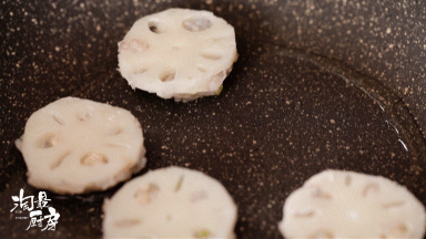 4. 切完的藕片上抹生粉,再铺上虾胶。