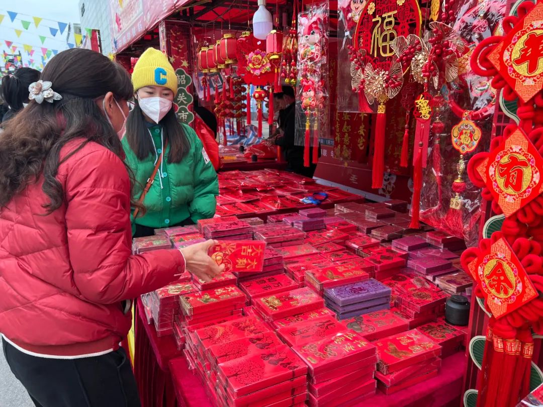 市民在购买红包。罗奕麟 摄除了年花档口外,前来购买春联、福字和喜庆装饰品的市民也颇多。今年是农历兔年,含有“兔元素”的挂饰、红包和兔子玩偶特别受欢迎。“今年韶关的年味很浓,前两年都没回家,今年回来和家人一起挑选年货,非常开心。”购买了一些干花和过年饰品的市民张女士高兴地说。据商家介绍,这样火热的状态会一直持续到腊月二十九。