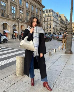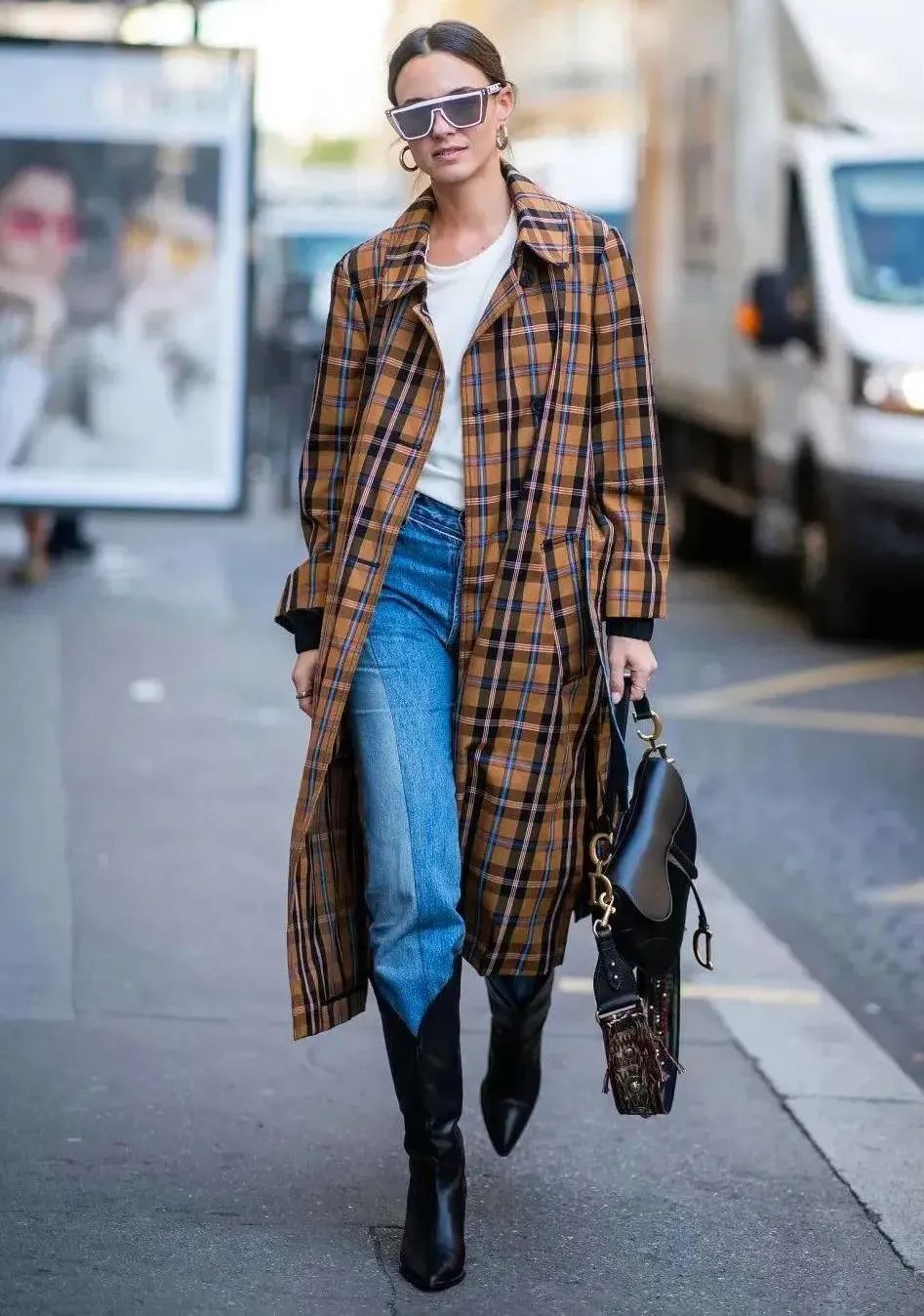 喜欢复古风格的姐妹,格纹外套+蓝色牛仔裤+棕色方头靴,经典永不过时。