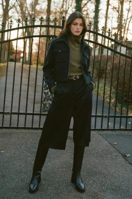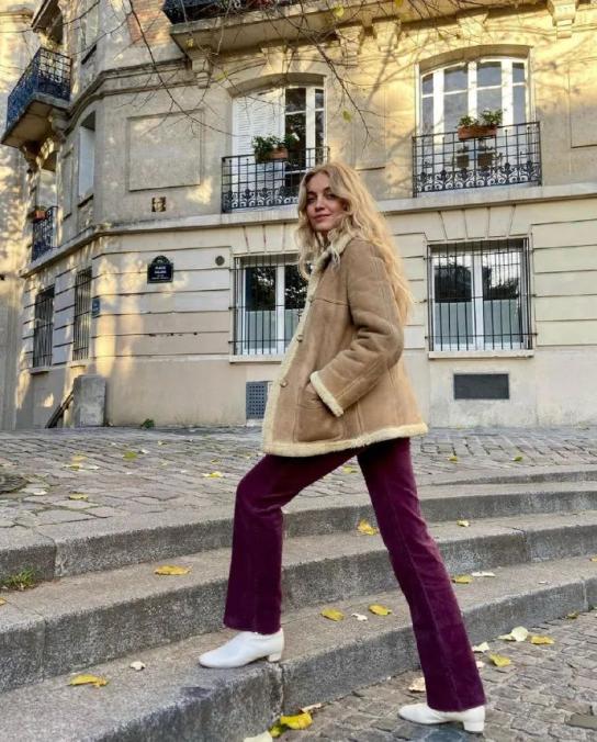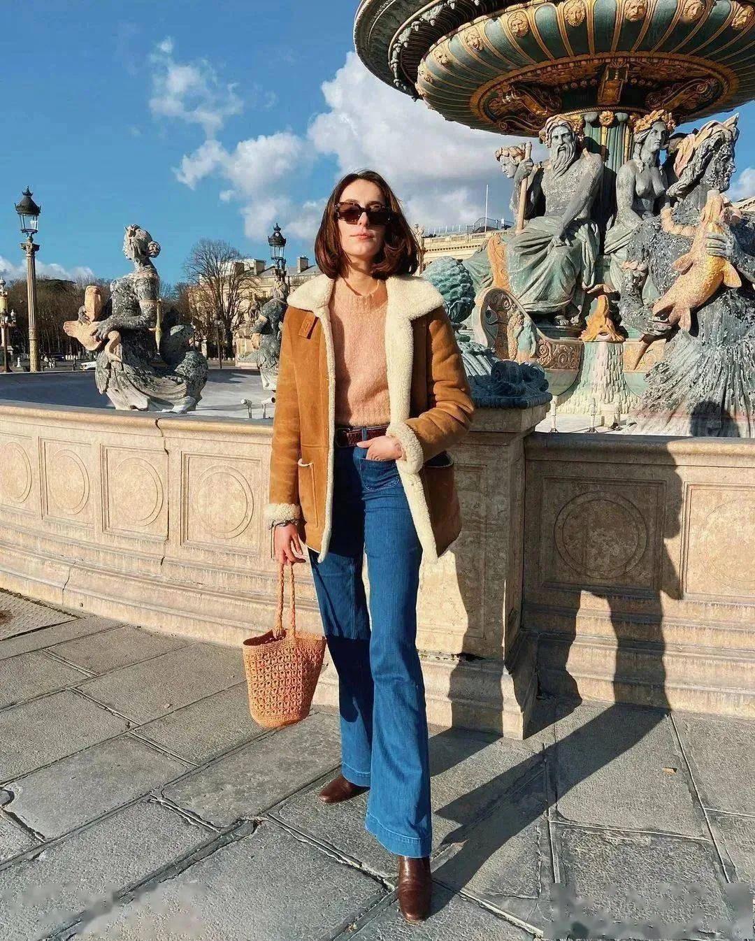 如果没有身材烦恼的姐妹,短外套+喇叭裤+高跟踝靴,整体更有女人味。
