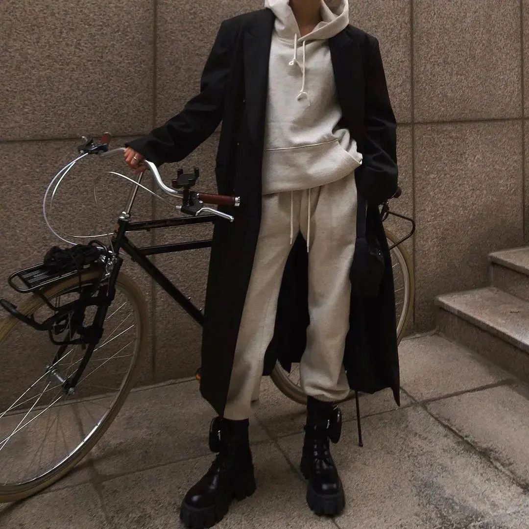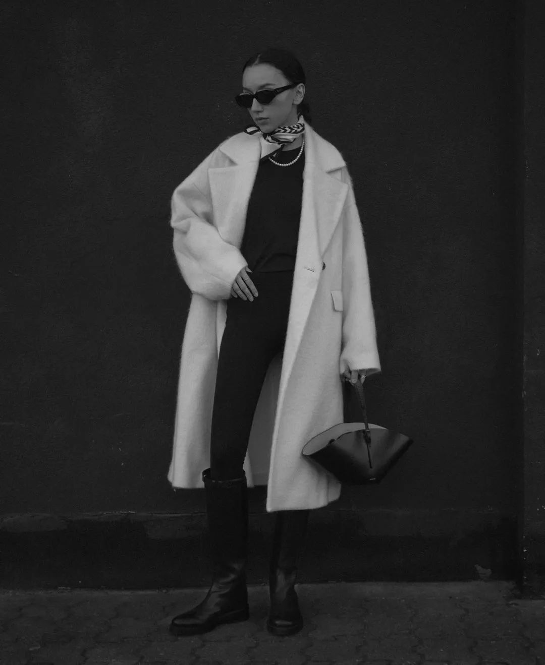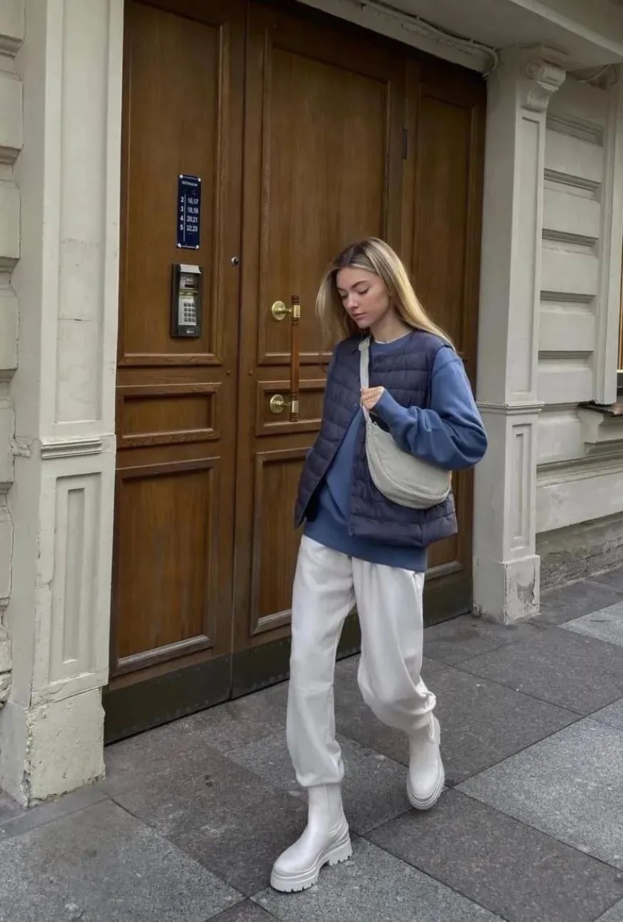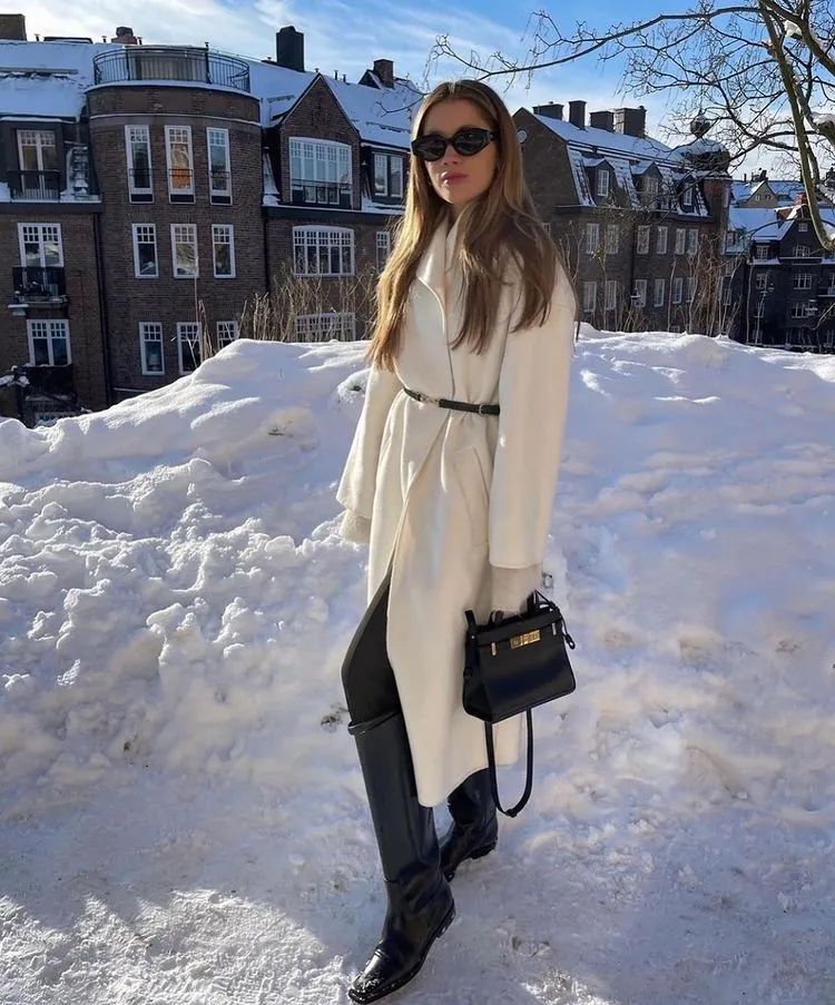 一身白的毛衣+卫裤,搭配骑士靴在冬天非常适配(但小个子真的很难hold住),外面简单一件长大衣就能尽显个人的风格美感~
