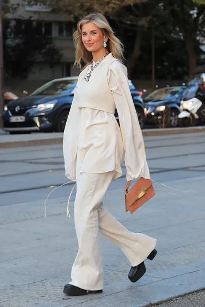 白色直筒裤搭配黑色BV靴,让整体造型看起来更加干净、利落。