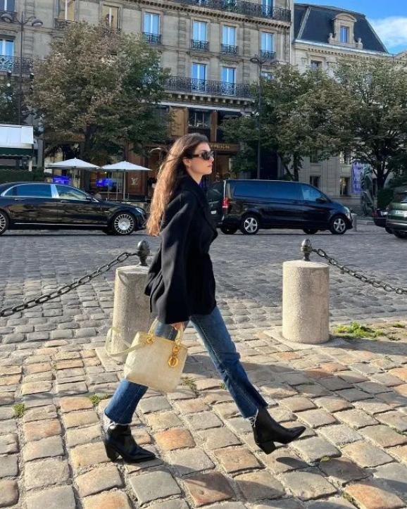 V口的牛仔靴加上尖头的设计,搭配直筒牛仔裤,最大程度起到“显瘦挺拔”的效果~