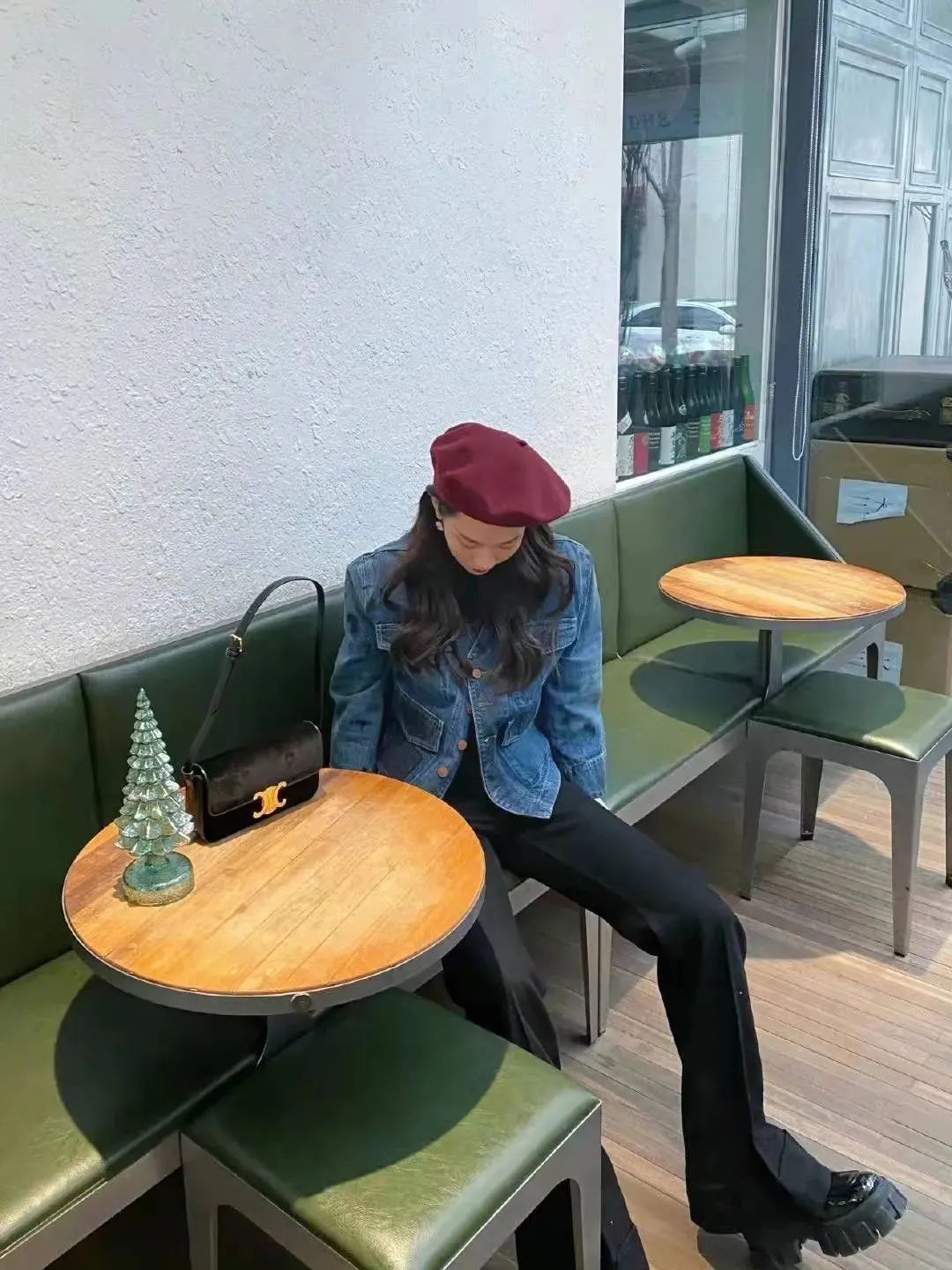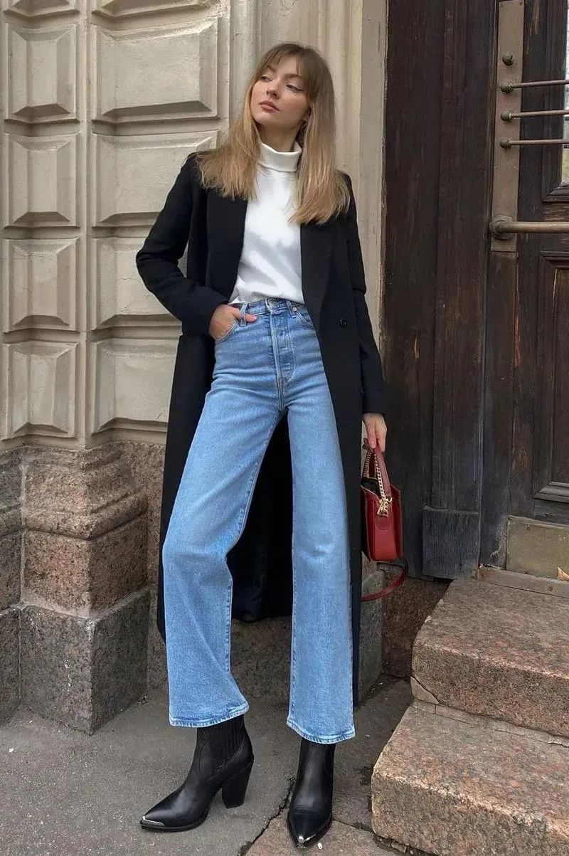 蓝色的直筒裤搭配酒红色踝靴,外加一件长大衣,给你整个冬天的高级感。