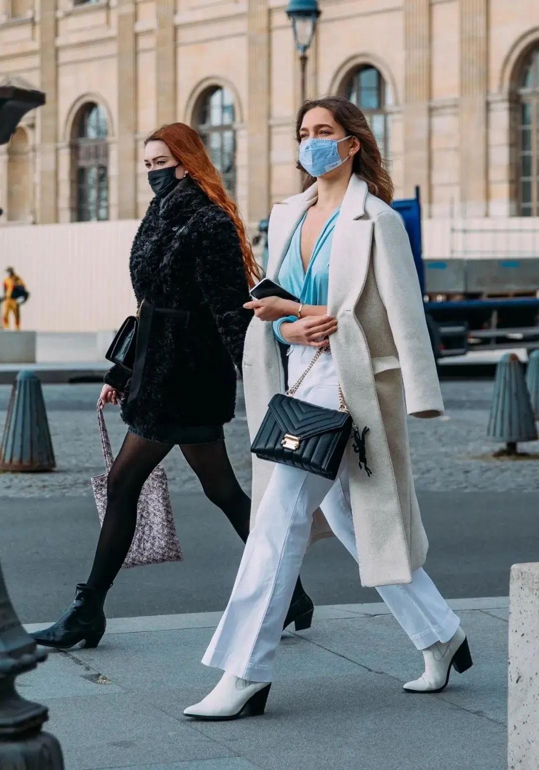 搭配窄口法式踝靴,内搭一件黑色针织衫,有了白色直筒裤的加入,反而不会显得暗淡。