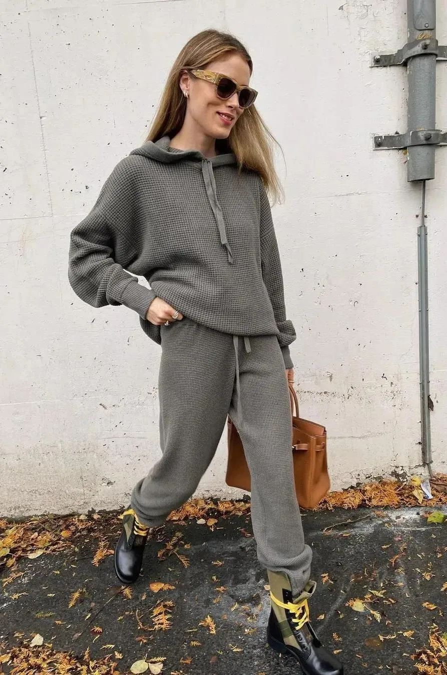 一身华夫格运动套装,休闲感十足,搭配马丁靴,瞬间提升整个造型感。