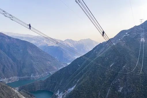 ▲四川省凉山彝族自治州雷波县,国网四川电力员工在高空走线验收输电工程线路