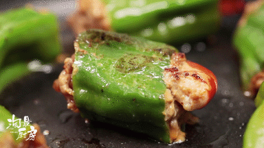 在青椒内壁抹上淀粉,可以防止肉馅在煎制时脱落。