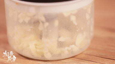 往1调羹(15g)蒜末中加入生抽、老抽、蚝油各1调羹(15ml)。