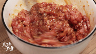 把肉馅用筷子顺着同一个方向搅拌均匀。