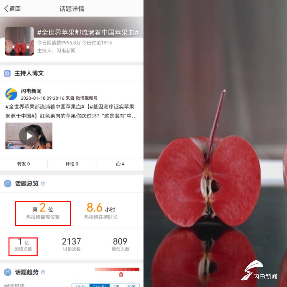 该作品不仅斩获了广电总局季度优秀广播电视新闻作品,#山东科研团队证实苹果起源于中国#还登上了全国微博热搜第20位。山东人想低调,热搜“不允许”,跟魏德友节目一样,陈学森的故事在春晚前同样未播先火。#全世界苹果都流淌着中国苹果血 微博话题冲上全国热搜榜第2,网友留言“赢麻了”。