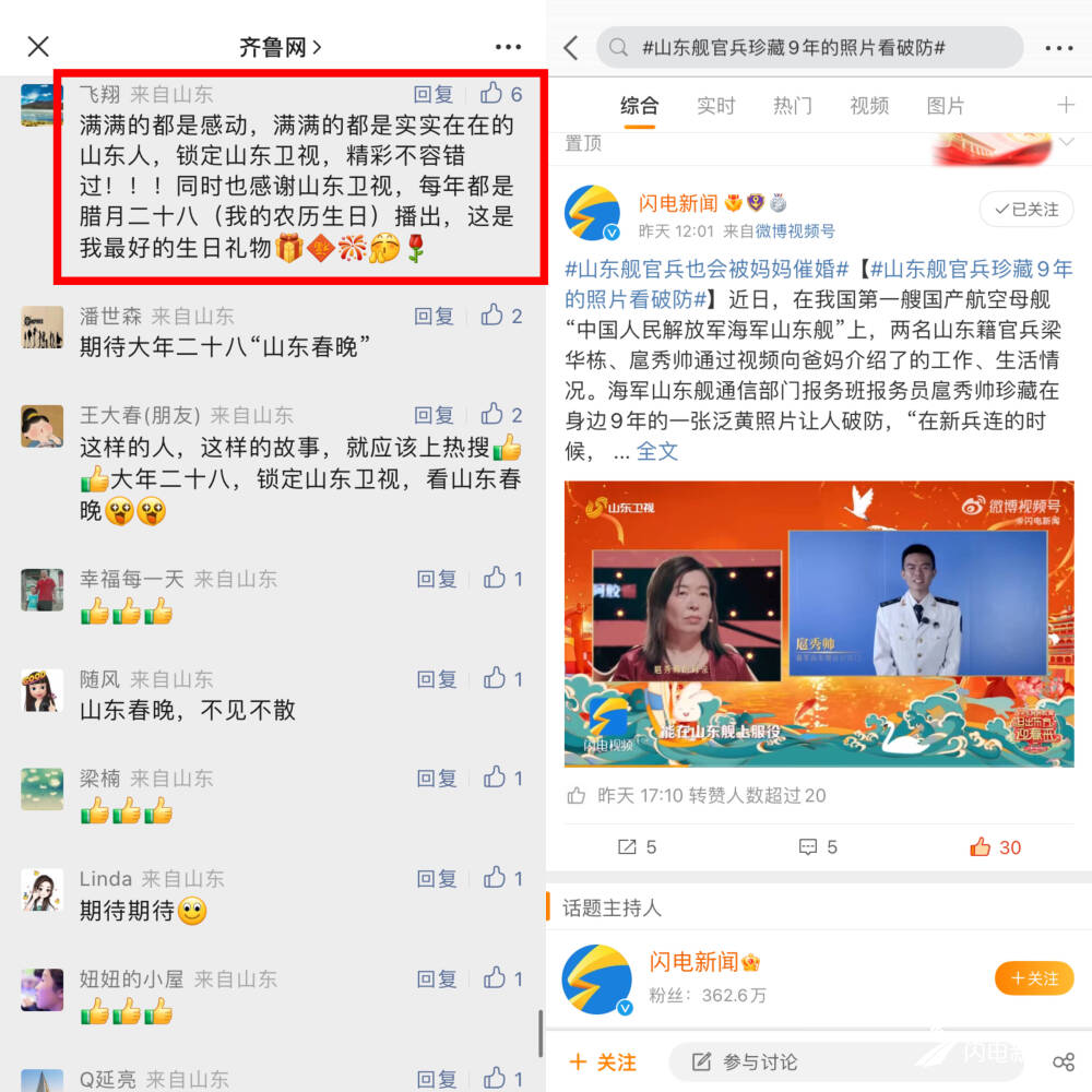 节目未播先火,微博话题#山东姑娘辞职接替父亲戍边6年、#夫妻戍边近60年回家过年2次 冲进微博全国热搜榜,话题阅读量破1.4亿。