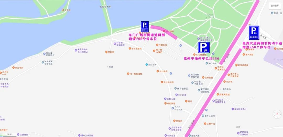 景区东门:原停车场停车位约300个,东门广场南侧通道两侧增加临时停车位100个、星湖大道两侧非机动车道增加临时停车位250个。