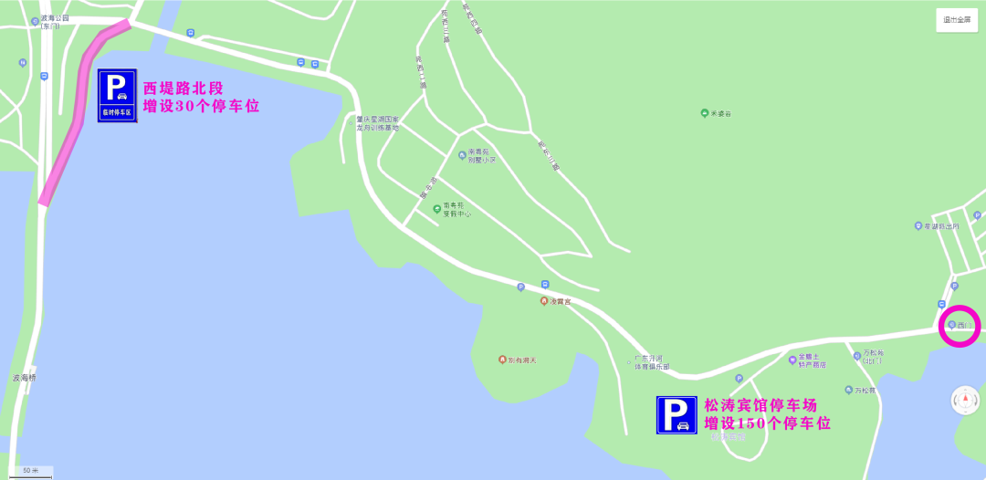 景区西门:原停车场小车位288个,大巴车位7个,无障碍车位8个,合共303个。松涛宾馆停车场视情况可增加车位150个、西堤路北段可增加车位30个。