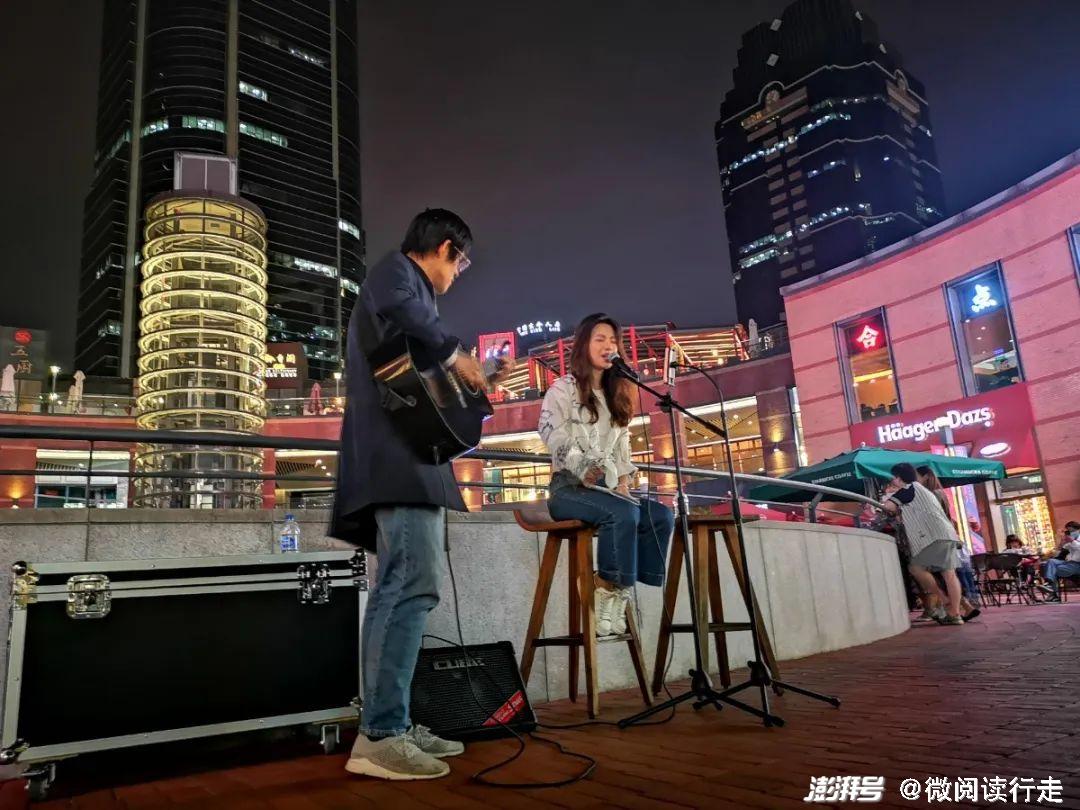 下班后聚集在96广场聆听绿洲青年演唱的年轻人