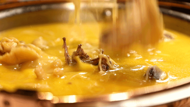 入冬时节,一锅热气铺面的猪肚鸡亦是进补首选,广东人更为这道菜取了一个霸气侧漏的花名,叫做“凤凰投胎”,为此须用一个完整的猪肚和一只全鸡,才能衬出这等霸气。烹饪做法上更是如此,须将胡椒料包入鸡的内腹,再将鸡塞入猪肚内封口,若是塞入有些困难,也可将鸡切成小块,之后用文火慢炖,逐渐浸透、融合胡椒和肉的香味,最终释出的汤体顺滑而不腻味,鸡靓、肚脆、汤好喝,白胡椒的辛香通窍开胃,让人由内而外的通透温暖。