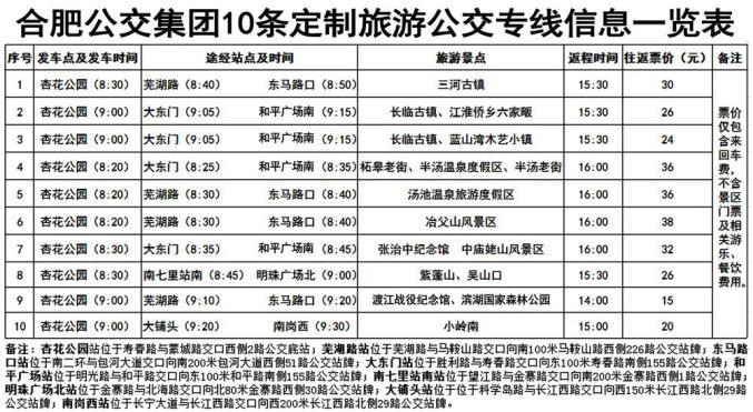 为方便市民乘客春节期间前往合肥周边景区郊游,欢度文明祥和的新春佳节,2023年春节1月24日(农历正月初三)至27日(农历正月初六)期间将继续开通10条定制旅游公交专线(详见附表)。为方便乘客就近乘车,10条定制旅游公交专线均在市区增设了中途乘车点,部分定制旅游公交线路还新增了途经人文景点,以更好满足乘客需求,提高乘客出行体验。