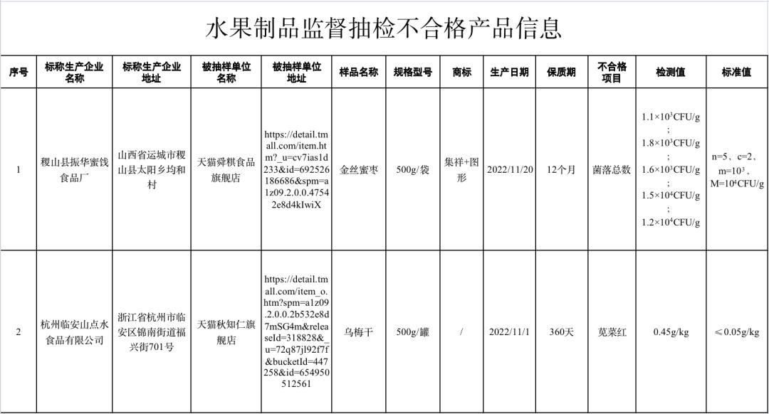 天猫舜粸食品旗舰店(经营者为山西老鲁记电子商务有限公司)在天猫商城(网店)销售的、标称山西省运城市稷山县振华蜜饯食品厂生产的金丝蜜枣,其中菌落总数不符合食品安全国家标准规定。