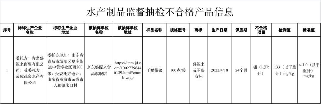 二、重金属污染问题京东盛源来食品旗舰店(经营者为山东省青岛盛源来商贸有限公司)在京东商城(网店)销售的、标称山东省青岛盛源来商贸有限公司委托山东省威海市荣成茂泉水产有限公司生产的干裙带菜,其中铅(以Pb计)检测值不符合食品安全国家标准规定。