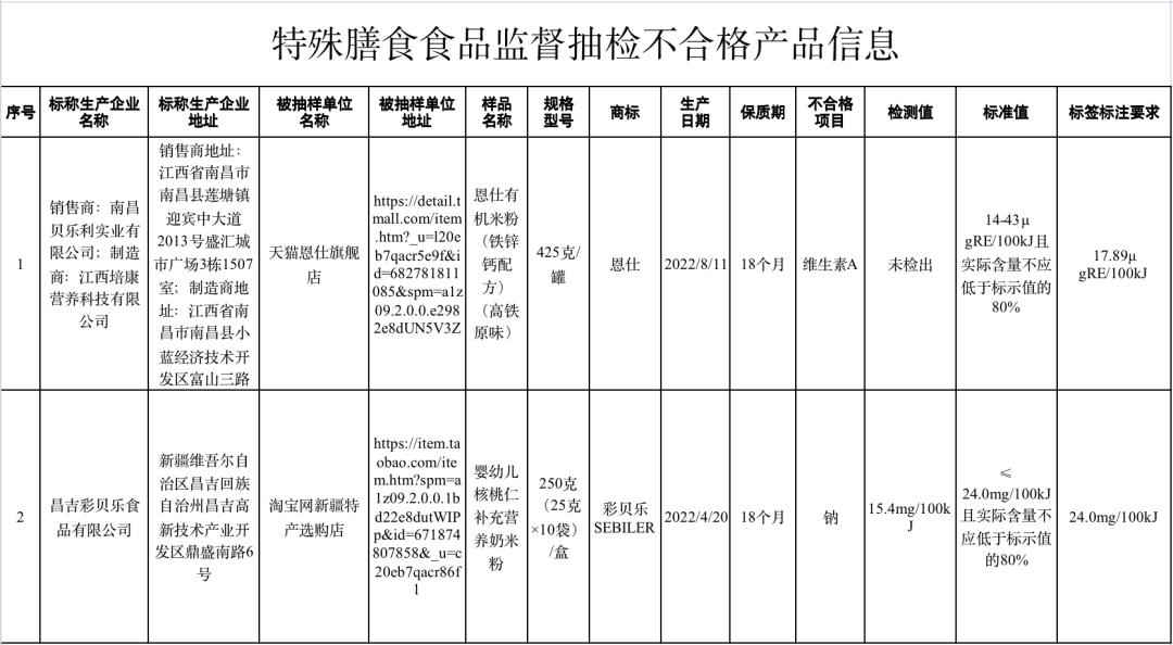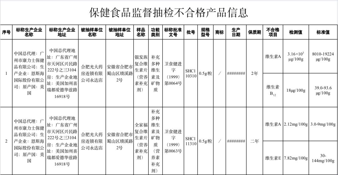 (四)天猫恩仕旗舰店(经营者为江西省南昌市恩仕健康产业有限公司)在天猫商城(网店)销售的、标称江西省南昌贝乐利实业有限公司销售的、江西培康营养科技有限公司生产的恩仕有机米粉(铁锌钙配方,高铁原味),其中维生素A含量既不符合食品安全国家标准规定,也不符合产品标签标示要求。(五)安徽省合肥光大药房连锁有限公司永达店销售的、标称广东省广州市康力士保健品有限公司中国总代理的、恩斯海国际股份有限公司(原产国:美国)生产的1批次银发族复合维生素片(营养素补充剂),其中维生素A、维生素B12含量不符合产品执行标准要求;1批次全家福复合维生素片(营养素补充剂),其中维生素A、维生素E含量不符合产品执行标准要求。