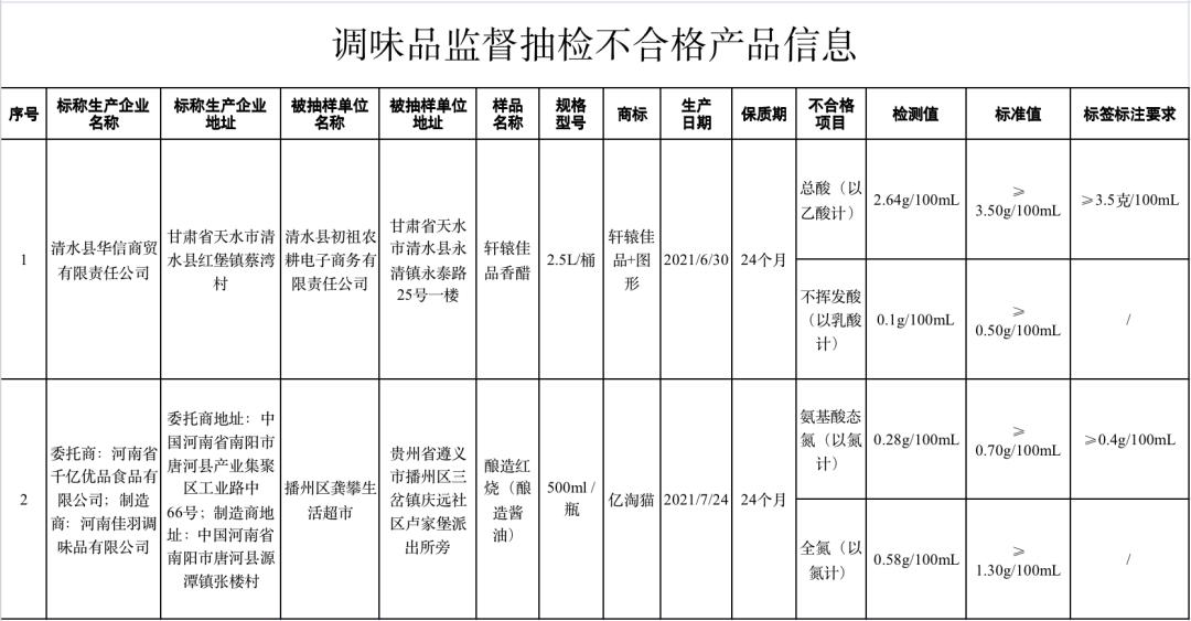(六)甘肃省天水市清水县初祖农耕电子商务有限责任公司销售的、标称甘肃省天水市清水县华信商贸有限责任公司生产的轩辕佳品香醋,其中总酸(以乙酸计)含量既不符合食品安全国家标准规定,也不符合产品标签标示要求,不挥发酸(以乳酸计)含量不符合产品标签标示要求。