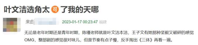王子文饰演的青年叶文洁,也相当惊喜。第六集起,随着往事的展开,人物的层次感和复杂性开始显现。