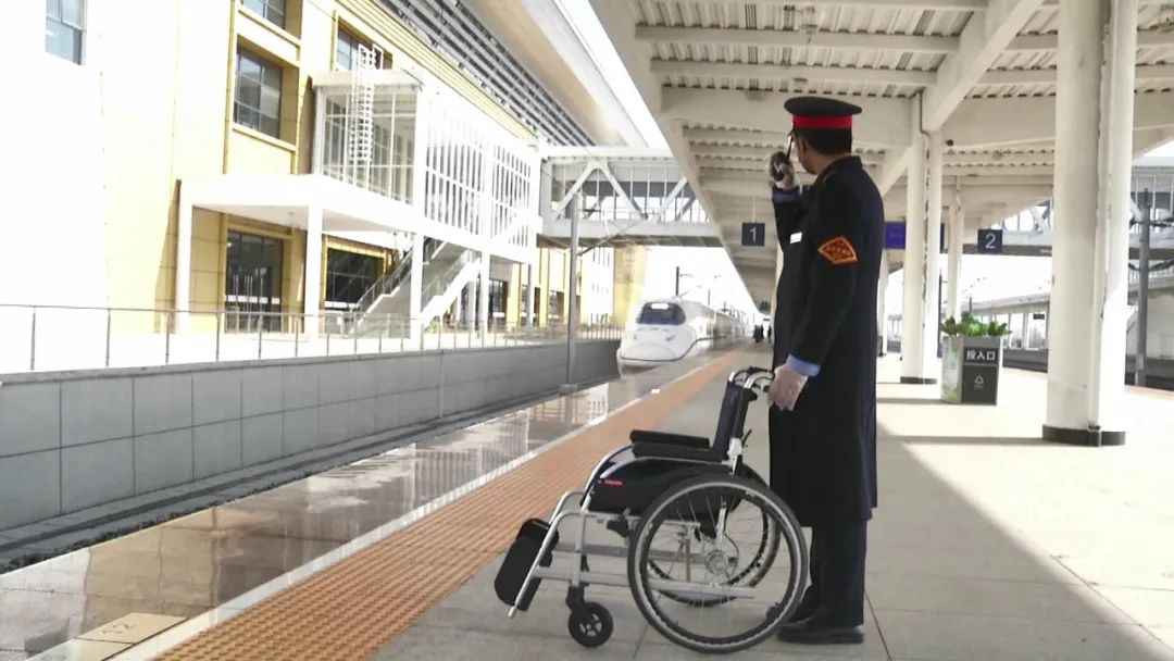 赶着回家陪婆婆过年的唐梅华女士因为第一次到淮南南站乘车走错了候车室导致错过了列车。她找到康乐乐时,满眼焦急。了解情况后,康乐乐带着她帮她办理了改签,并详细告诉她在哪里候车。刚接完一班车的康乐乐接到通知,下一趟列车有一位需要轮椅接车的旅客即将进站,康乐乐又赶忙返回服务台去推轮椅。在等候列车的过程中,康乐乐告诉我们,他去年10月份才结婚,对于春节期间上班,他的爱人非常理解和支持,没有丝毫抱怨。正说着话,列车进站了,康乐乐赶忙和乘务长一起帮助脚受伤不能行走的旅客坐上了轮椅。
